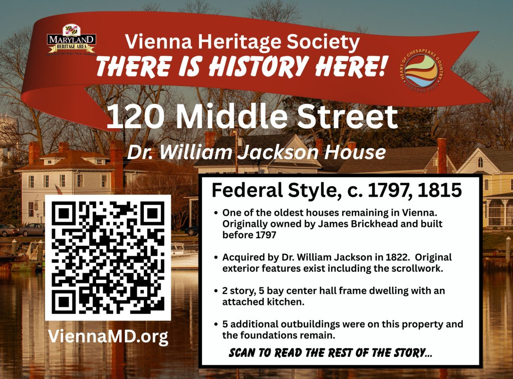 The middle 1 ½ story part with a colonial fireplace, wood panels, and enclosed staircase may be the earliest Vienna home. Perhaps being moved from the early founding homes up north. The front part of the house, overlooking the Nanticoke River, was built in 1877 by Dr. Ewell operated his practice from the house for about 50 years. A rear part was added in the 1980’s with some restorations since then. In 2002, a small cannon ball (grapeshot) was unearthed below the front door.